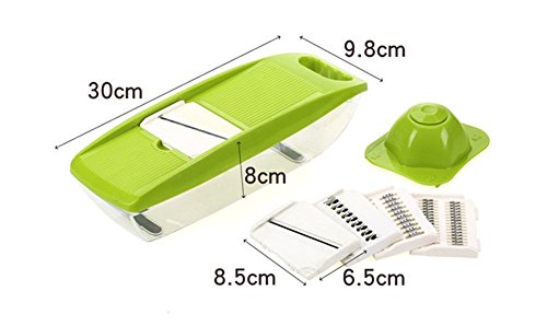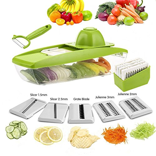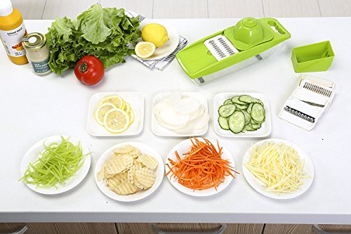 - SLICE, JULIENNE & GRATER ALL YOUR VEGGIES: Enjoy picture-perfect cabbage,zucchini, carrot,cucumber or onion slices, julienne vegetable strips, waffled potato chips or grated cheese in just minutes! Space saving and dishwasher safe, this adjustable mandolin slicer / vegetable cutter / food chopper is a must have for every health conscious individual!