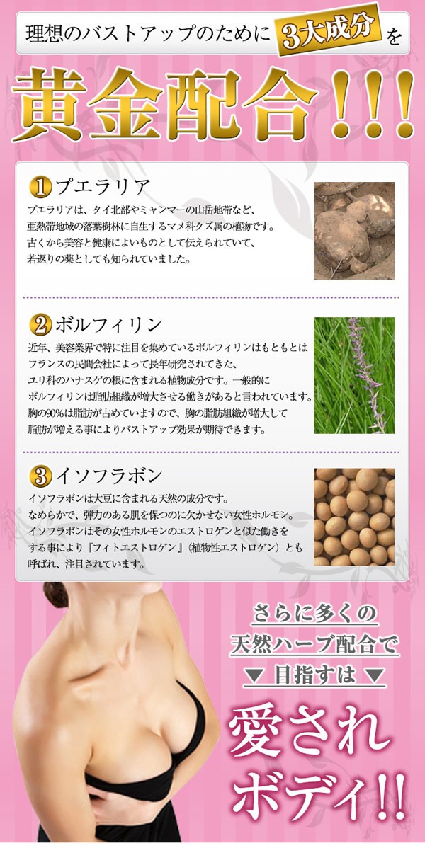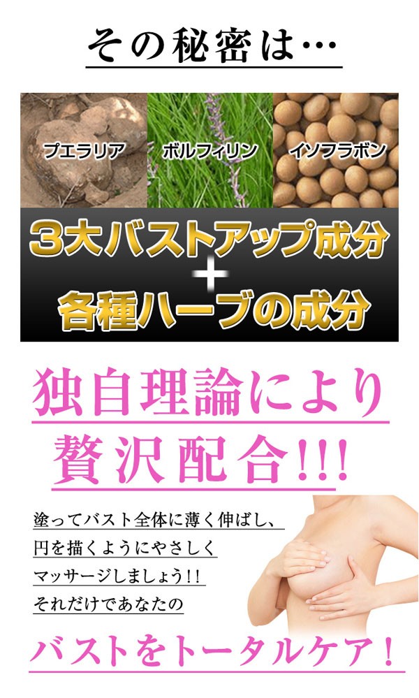水、グリセリン、BG、プエラリアミリフィカ根エキス、ハナスゲ根エキス、