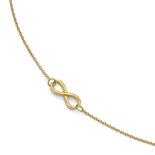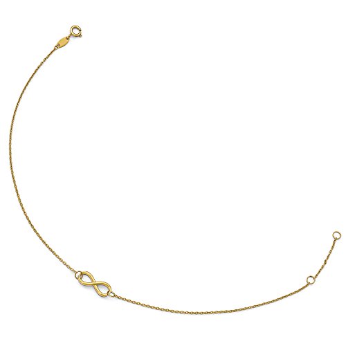 Indulge in a little bling for your leg with a shiny 14k yellow gold adjustable anklet featuring a single infinity link station on a delicate 1mm width cable chain design that closes with a spring ring clasp. The infinity link is approximately 6mm in width by 15mm in length. It is adjustable from 9 or 10 inches in length.Feature