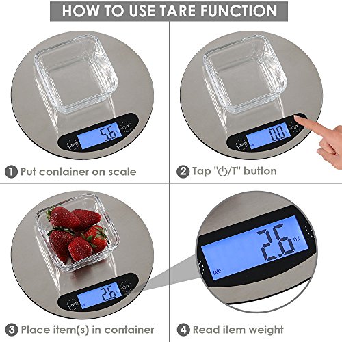 - Tare option allows you to place a bowl on the scale, press the button to zero the scale and weigh your food/ingredients accurately. Each scale also has non-slip rubber feet.