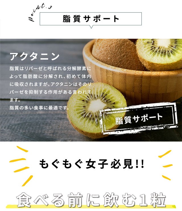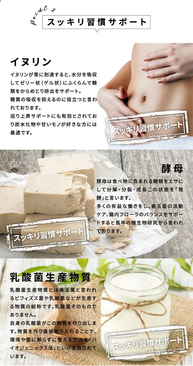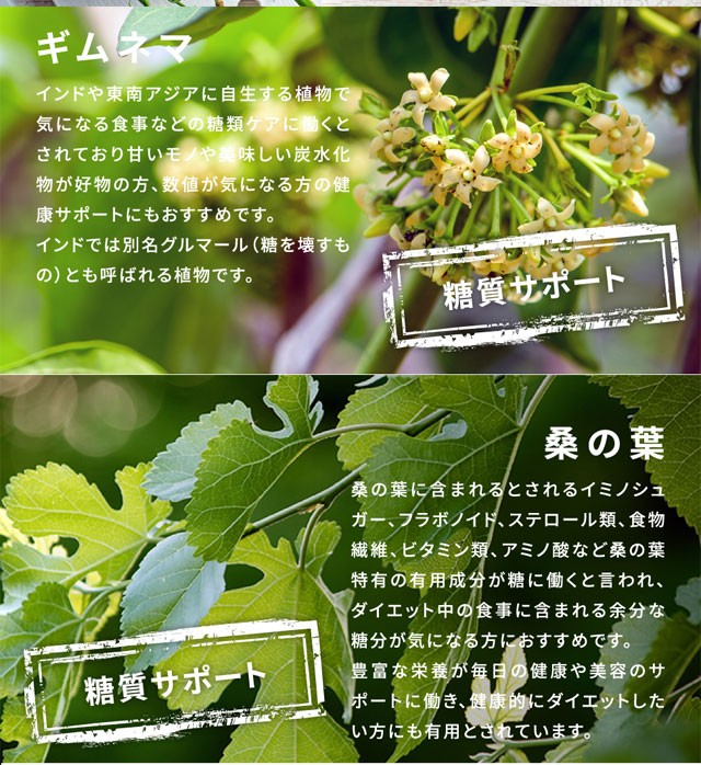 | 原材料名 | サラシアエキス末、イヌリン、白インゲン豆抽出物、乳酸菌生産物質粉末(大豆、乳酸菌)、穀物麹末、桑の葉末、ギムネマ・シルベスタ抽出物、キウイ抽出物(アクタニン)/ゼラチン |