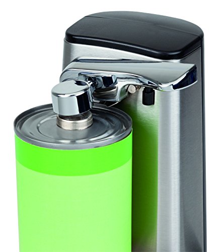 Tall can opener opens cans safely and easily. Patented power pierce cutting mechanism for easy opening. Removable cutting blade for easy cleaning. Magnetic lid lifter allows for safe, easy removal of lids. Auto stop feature shuts the can opener off after the can is opened. Built-in knife sharpener and bottle opener. Ingenious retractable cord storage makes hiding that unsightly cord easier. Stainless steel design.Feature