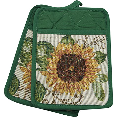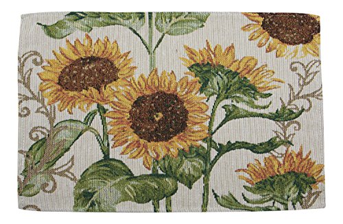 Our Sunflower Deluxe Tapestry Kitchen Linen Set includes everything you need to warm up your kitchen for any season. The sunflowers are the epitome of the a friendly, welcoming theme for your home and are featured in sunny shades of yellow, brown, and green. Each set includes 4 placemats, 2 kitchen towels, 1 oven mitt, and 1 potholder. The tapestry fabric is made from a cotton/polyester blend to resists stains and easy care. All items are machine washable.