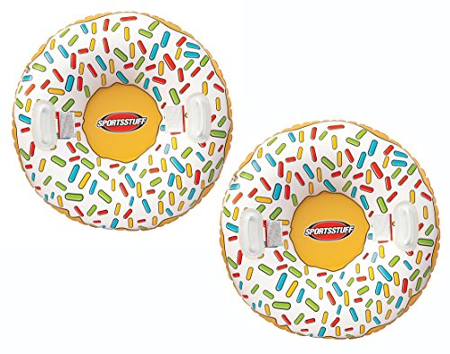 Studio : AirHead Publisher : AirHead Binding : Misc. Product Description Take a bite out of winter with this enormously fun, 3-foot wide donut snow tube. Complete with sprinkles, it's a sweet and guilt-free treat. Simply inflate, find a snowy hill, then grab the comfort grip handles and take off. The thick, durable construction is great for sledders of all ages. Pack of 2. 0