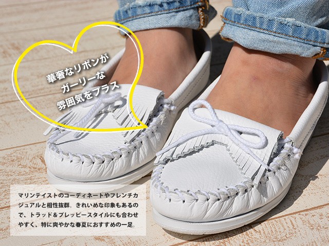| 商品詳細 | MINNETONKA ミネトンカ ひとつひとつが職人の手によるハンドメイドの、アメリカ生まれ老舗モカシンブーツブランド「MINNETONKA(ミネトンカ)」。数多くの海外セレブが愛用し、日本でも雑誌や人気スタイリストのブログで紹介されるなど多くのメディアで取り上げられています。しっかりした厚手のスムースレザーを全面に使用したフリンジモカシン「KILTY UNBEADED(キルティアンビーデッド)」。華奢なリボンがガーリーな雰囲気をプラス。靴底は滑りにくいボートソールは、ほどよい弾力性と固さがあり、履き心地・歩きやすさに優れています。涼しげなカラーとすっきりとした素材感は、マリンテイストのコーディネートやフレンチカジュアルと相性抜群。きちんとした印象もあるので、トラッド&プレッピースタイルにも合わせやすく、特に爽やかな春夏におすすめの一足。 ※ご購入前に下記、商品の特徴と注意点を必ずご確認ください。 在庫倉庫にて混在して管理しておりますので、お選び頂けません。 付属の箱は輸入過程にて、若干の破損や汚れなどがあるものもございます。 生産国についてはその他諸外国にて生産している場合がございます。 ●ハンドメイドの特性で全商品に見られる特徴 ・中敷の有無、ソール(底)の仕様異なる場合 ・靴の製造上やむを得ない傷 ・フリンジの長さに多少バラつき ・左右で革の質感が異なる ・表記サイズより若干誤差 ●入荷時期で商品によって変更あり ・ソール、ステッチ、ファスナー、内側の刻印内容等 ・ジップのメーカーが左右で異なる ・内側の刻印がMinnetonkaのロゴが無く、原産国の刻印がある ●商品の着用時の注意点 最初は色落ちする場合もございますので、濃い目のソックスのご利用をおすすめいたします。スエードの性質上、部分的に色ムラ、擦れ等が見られる場合がございます。 ![]() | ||