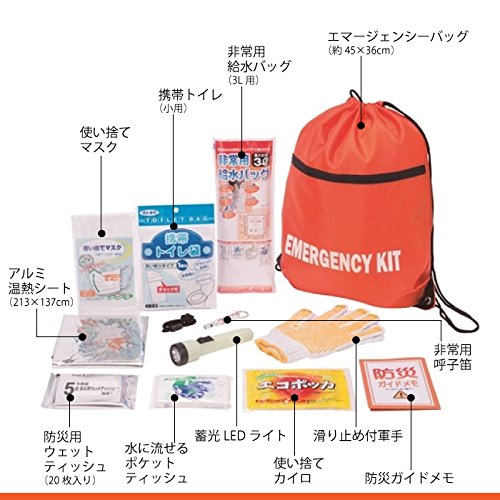 【세트내용】emergency(응급) 백,축광LED라이트,알루미늄 온열 씨트,수에 흘려 보내는 포켓 티슈(10매)고, 비상용 급수 백(3L용)고, 미끄럼방지부 목장갑,일회용 카이로,일회용 마스크,방재용 Wet 티슈(20매)고, 휴대 화장실(볼일)고, 비상용 요부코적,방재 가이드 메모
