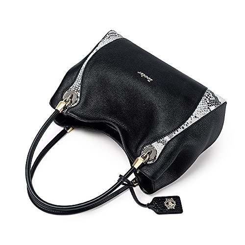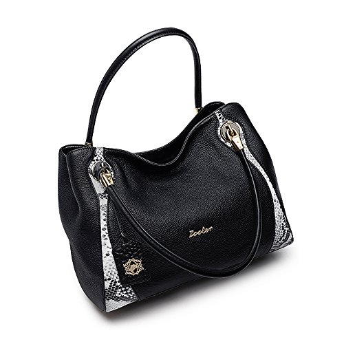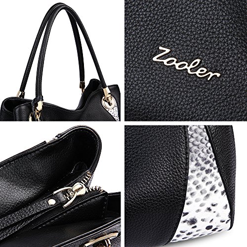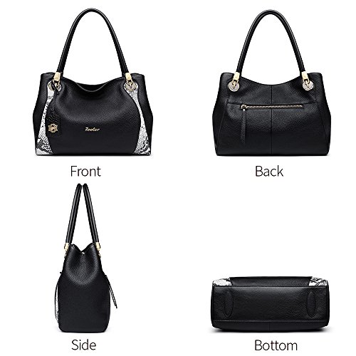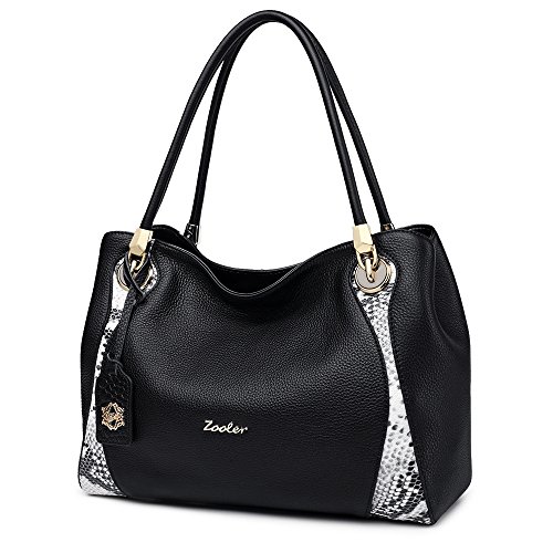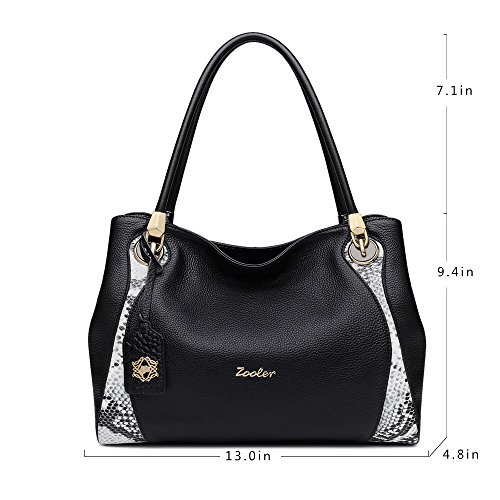 -. Feature : Brand: ZOOLER is an US registered trademark, unauthorized sale without permission, we will investigate for legal responsibility. Please pay attention to avoid purchasing counterfeits from other sellers. / Material: Genuine top layer cowhide leather. Bottom, zipper tap, bottom of handle and inner pocket binding are microfiber leather. The color contrast between black cow leather and white snakeskin pattern leather makes the purse gorgeous and outstanding. A removable hanging drop with pattern logo is attractive, makes it elegance. This purse doens't come with a long shoulder strap. / Closure& Hardware& Lining: Top zipper closure. Could zip smoothly. High quality plating golden hardware with high antioxidant activity. Fully lined durable polyester lining. Pullers are made of leather and hardware, fashion and elegant. There are 2 leather pads on the bottom, extend the usage of life. / Structure: Interior two compartment pockets(divided by central zip pocket) with 2 zipper pockets and 2 multifunctional pockets, may make your items well organised. Exterior 1 zip pocket, convenient to put in or take things out. / Size: Large capacity, can easily hold your cell phone, wallet, perfume, umbrella and other daily essential things. Dimension:(L*W*H)13.0"*4.8"*9.4"(33*12.2*24 cm). Net Weight: 0.8 kg(1.76 lb). Height of handle:7.1"(18 cm).