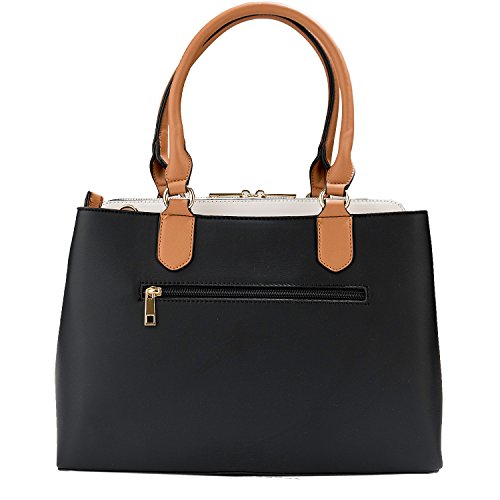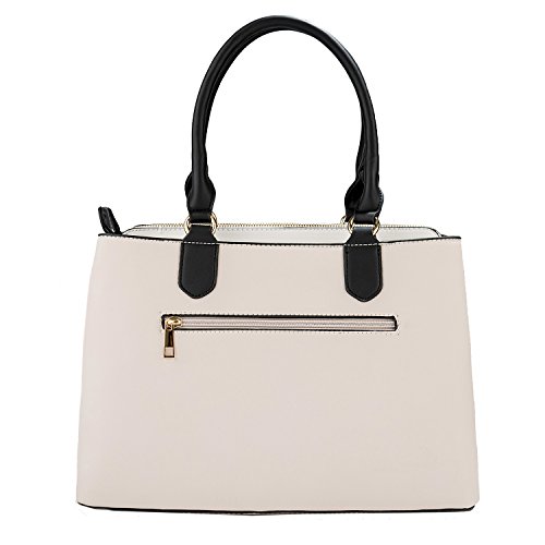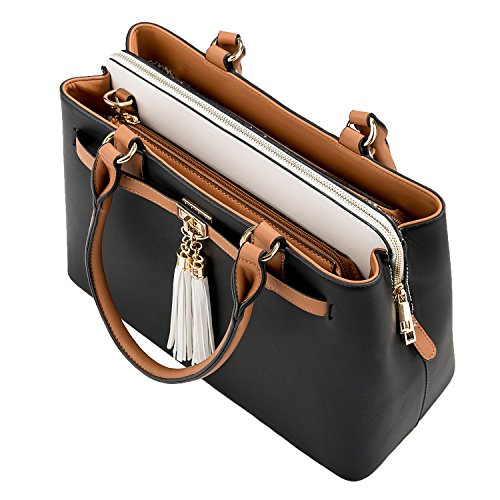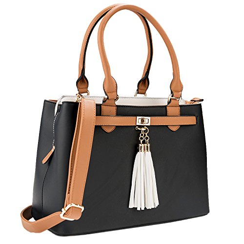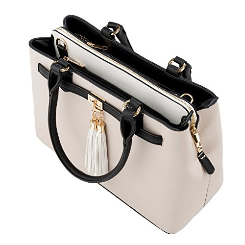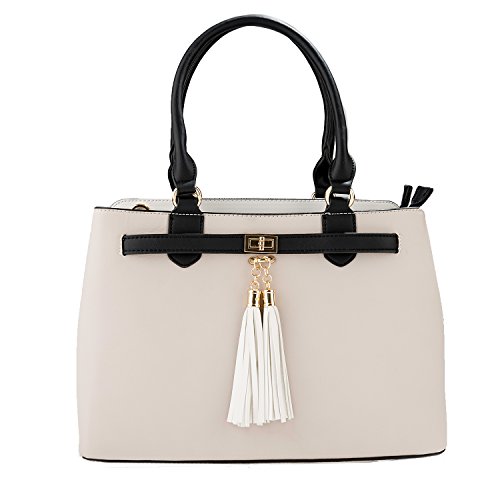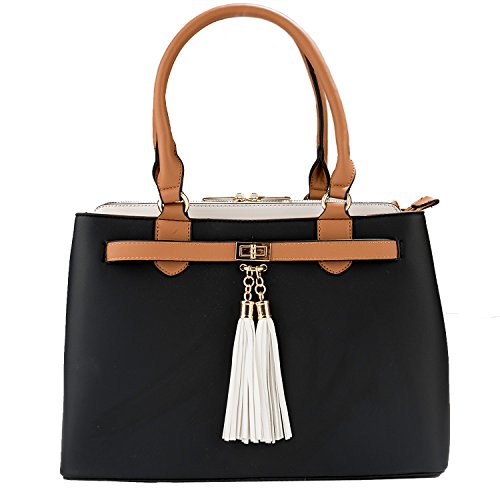 -. Brand : Vangoddy -. Department : womens -. Feature : Exterior wrapped in durable leatherette material accented with metal hardware, chic tassels, and rear zippered compartment for quick access to desired items / Stacked design offers 3 side-by-side interior storage compartments each with zippered closure / Can be carried comfortable in-hand or worn on the shoulder using either the dedicated top handles or the included shoulder strap / Bag measures 13" x 9.5" x 6in / Drop from top-handle to bag measures 9inches | Drop from included shoulder strap to bag 25inches max -. Model : EHHDBLEA08xAP.00 -. MPN : EHHDBLEA08xAP.00 -. PartNumber : EHHDBLEA08xAP.00 -. ProductGroup : Shoes -. ProductTypeName : HANDBAG -. Title : Two-Tone Elisa Top Handle Satchel Handbag