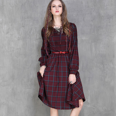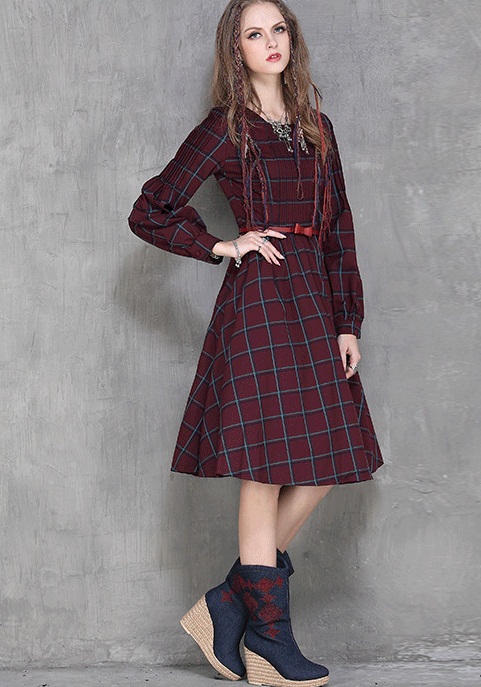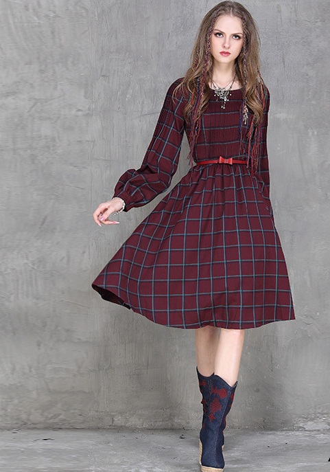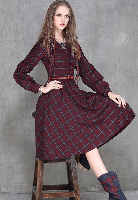 #チェックワンピ#ガーリー#丸襟#膝下丈#長袖#ワインレッド