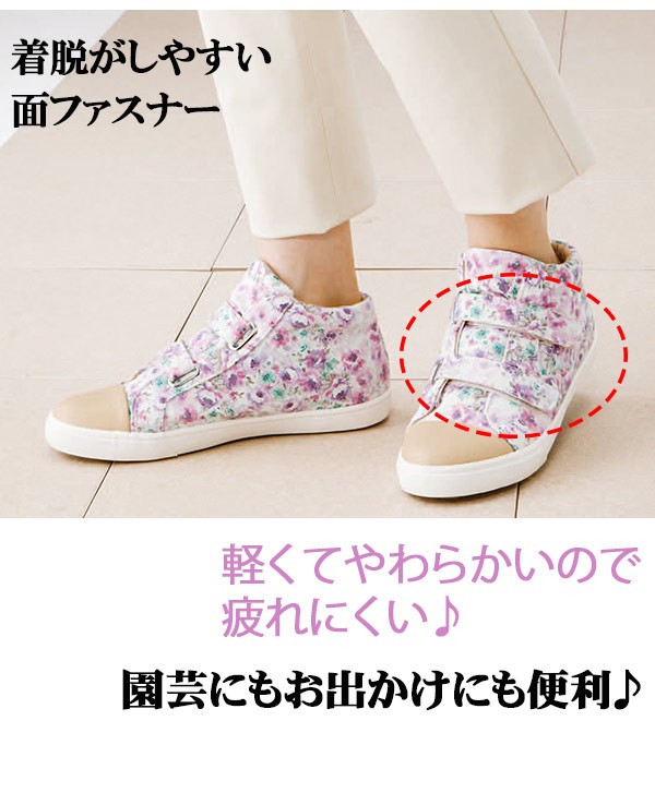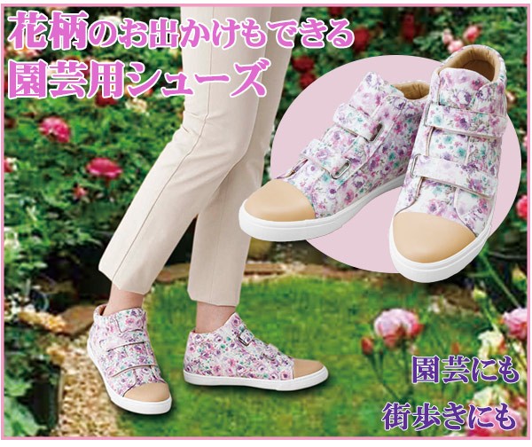 | <h1>かわいい花柄の園芸用シューズです♪土や水が入りにくい縫製、泥や水が染み込みにくい生地で機能性抜群!オシャレに園芸を楽しんで頂けます。軽くてやわらかいので疲れにくく、長時間の作業やお出かけにも便利です。 園芸/ガーデニング/花柄/オシャレ/靴/ハイカット/スニーカー/ガーデニングシューズ/ガーデンシューズ/ガーデンブーツ/軽い/軽量</h1> |