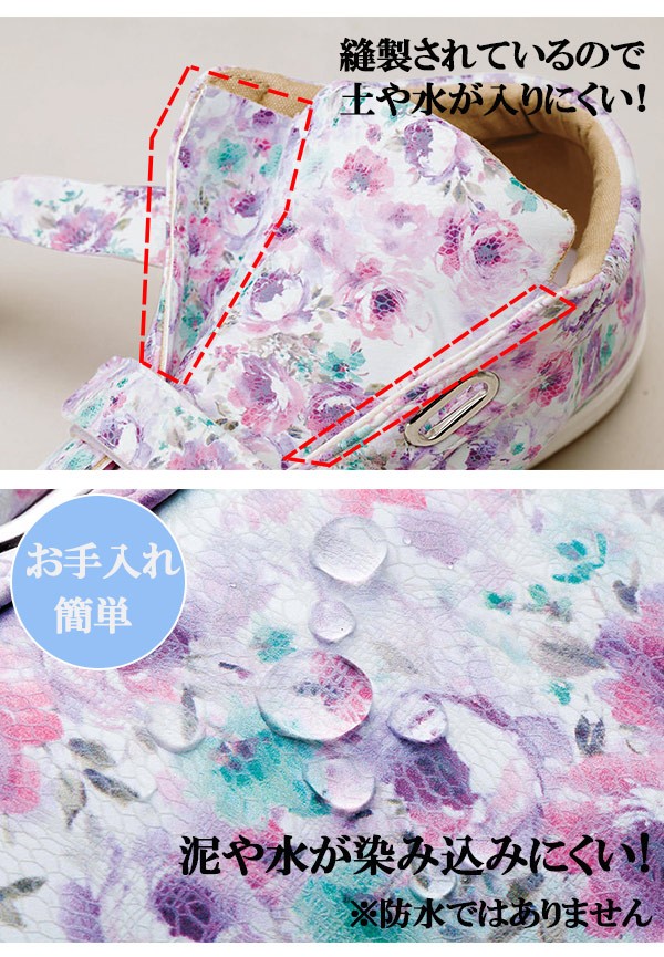 | かわいい花柄の園芸用シューズです♪土や水が入りにくい縫製、泥や水が染み込みにくい生地で機能性抜群!機能性とデザイン性を兼ね備えているのでオシャレに園芸を楽しんで頂けます。着脱のしやすい面ファスナー2本で足にフィット!軽くてやわらかいので疲れにくく、長時間の作業やお出かけにも便利です。 |