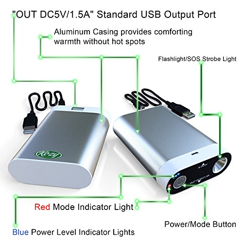 - Feature : Powerful - 7800mAh Lithium Batteries for reliable, long lasting warmth - rechargeable over 500 times / Consistent - Aluminum Casing provides consistent, soothing heat on all sides / Adjustable - 2 temperature settings for adjustable, comfortable warmth / BONUS - Free Warmer Pouch designed to enhance warmth in extreme cold conditions / Special Features: Power Bank / Charger for mobile phones, cameras, MP3 players, & other devices. AND a bright LED Flashlight & Emergency SOS Strobe Light