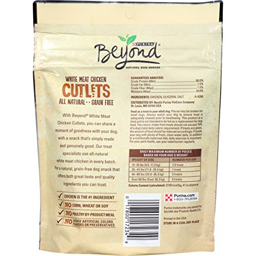 -. Binding : Misc. -. Brand : Purina Beyond -. EAN : 0607963706637 -. Label : Purina Beyond -. LegalDisclaimer : Actual product packaging and materials may contain more and different information than what is shown on our website. We recommend that you do not rely solely on the information presented and that you always read labels, warnings, and directions before using or consuming a product. -. Manufacturer : Purina Beyond -. MPN : 017800172349 -. PackageQuantity : 12 -. PartNumber : 017800172349 -. ProductGroup : Pet Products -. ProductTypeName : PET_SUPPLIES -. Publisher : Purina Beyond -. Studio : Purina Beyond -. Title : PACK OF 12 - Purina Beyond White Meat Chicken Cutlets Natural Dog Snacks 2.7 oz. Pouch -. UPC : 607963706637