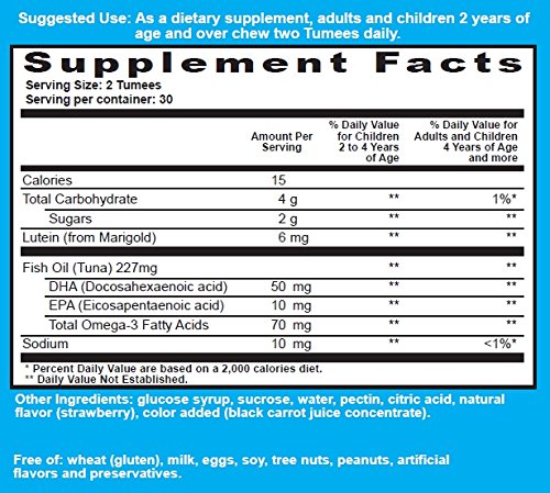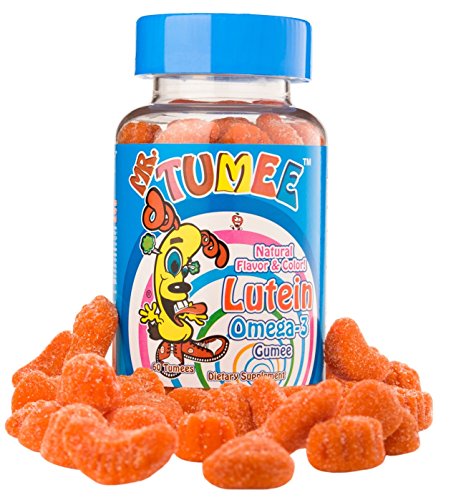 Mr. Tumee Lutein gummies come in natural fruit flavor (strawberry). They are gelatin free and made with natural flavor. They also contain Omega-3 Fatty Acids (DHA/EPA).