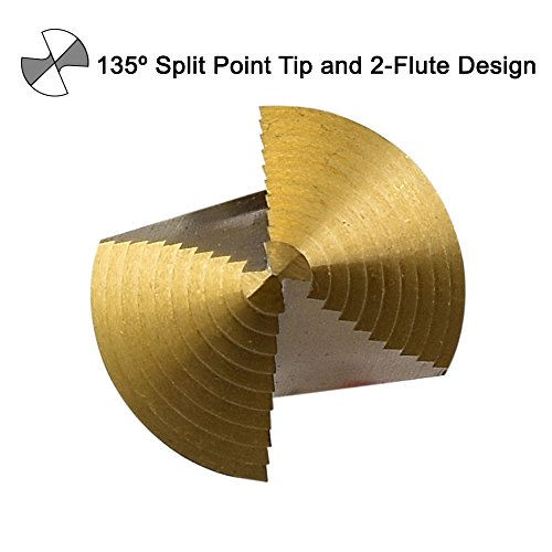 135° SPLIT POINT TIP AND TWO-FLUTE DESIGN: increases cutting speed with self-centering and prevents walking, clears chips faster and allows particles to escape easily
