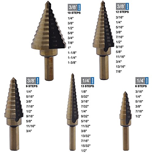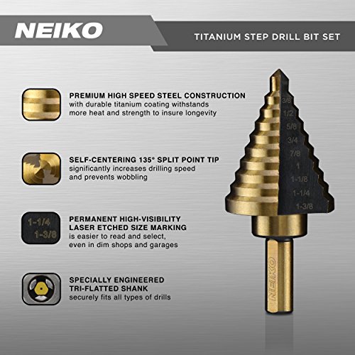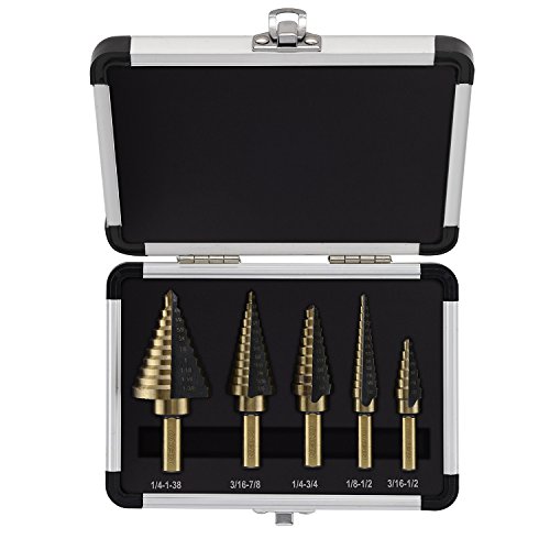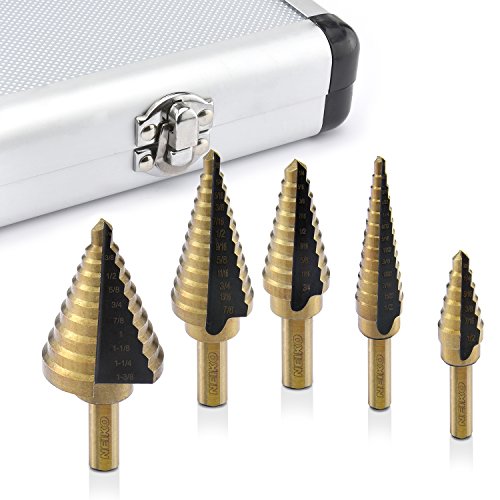 Neiko 10197A Titanium Step Drill Bit Set, High Speed Steel | 5-Piece Set | Total 50 Sizes