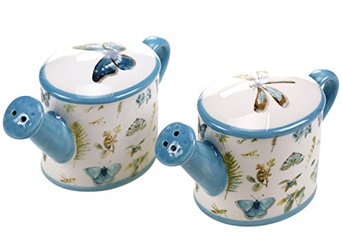 Green House Watering Can Salt and Pepper Shakers Set Ceramic Butterflies