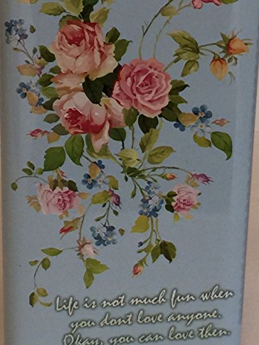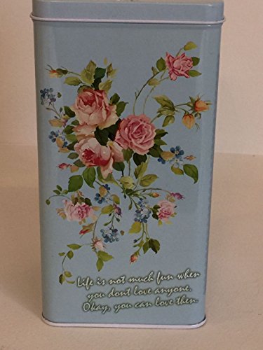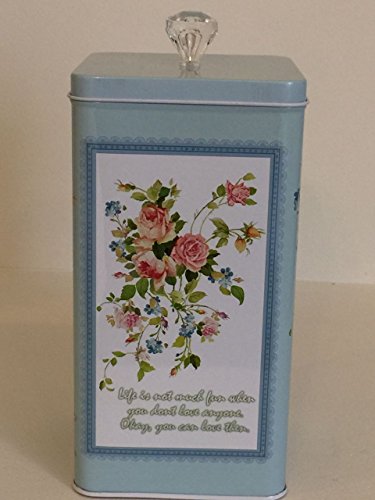 Elegant blue French style square shaped storage tin, shabby chic, with crystal knob on the top of the lid and floral design