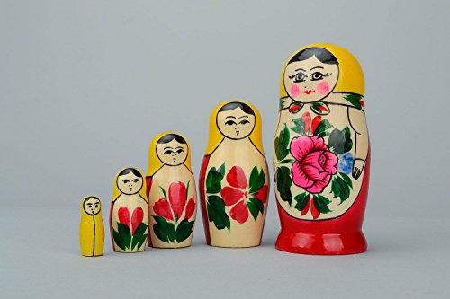 -. Feature : DETAILS - Beautiful souvenir in the form of matryoshka doll consists of 5 pieces. Figurines are made from basswood and coated with polyurethane varnish. Surface is painted with acrylic paints. /