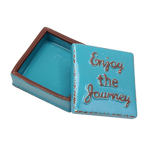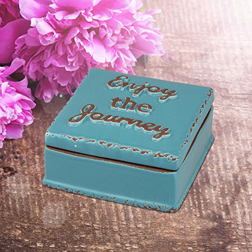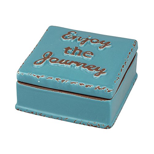- This ceramic keepsake box features a worn turquoise finish and the saying "Enjoy the Journey" raised on the removable lid giving a vintage feel