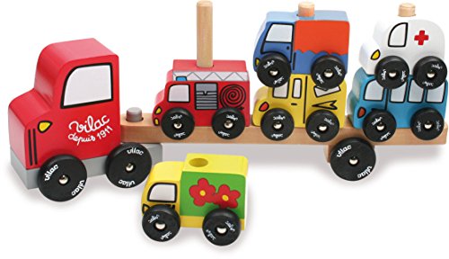 A beautifully crafted toy by well-respected toy makers Vilac who have been making toys for over one hundred years, whose passion and love of tradition is apparent in every item that they make. This wooden trailer with six individual cars is in a variety of colors and is exquisitely finished with fine details. The high quality finish means that this durable toy will stay hard wearing and bright even through regular use. The size, shape and weight mean that the toy is suitable for children from the age of two and up. Traditional and fun that helps to build hand eye co-ordination.Feature