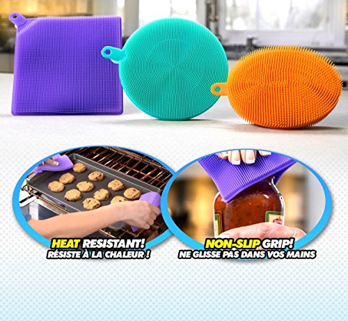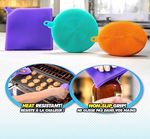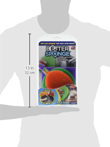 -. Feature : Better Sponge is made from high-grade silicon. The soft bristles are non-abrasive to use on surfaces that scratches easily. / Wide application: opening or removing jar lids, washing dishes and other kitchenware, glass / tile cleaner, as a non-abrasive alternative to removing soft-adhereing dirt from vehicles / Non-porous material is mildew-free and doesn't accumulate pieces of food materials. / Easy hang: Built in hook and suction cup for convenience; Each package contains 2 Greens, 2 Purples and 2 Orange sponges for a total of 6. / Sizes in inches : Purple (5.5 x 5.5, square); Green (5.5 across, round); Orange (5 x 3.8, oval).