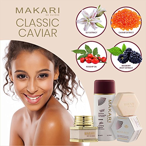 Redefine the meaning of classic beauty. For years, women of color have sought high-end skincare products designed exclusively for their unique concerns. Finally, with the Classic collection by Makari, everyone can achieve the clear, smooth, glowing complexion they've always dreamed of. Specially formulated for dry skin types, our Caviar Face Cream is enriched with super hydrating marine extracts, corrective multivitamins, and VegeclairineTM, a naturally derived active whitening agent. Morning and night, apply a thin layer to freshly washed skin, and watch as dark marks, acne scars, and discoloration fade away for a bright, youthful, perfectly even appearance. This ultra-moisturizing face cream refines the appearance of pores, balances texture, and instantly illuminates dry, ashy skin from within. It also fights free radical damage and minimizes fine lines and wrinkles. Use in synergy with Makari's complete line of Classic products to achieve your ideal shade of beautiful!