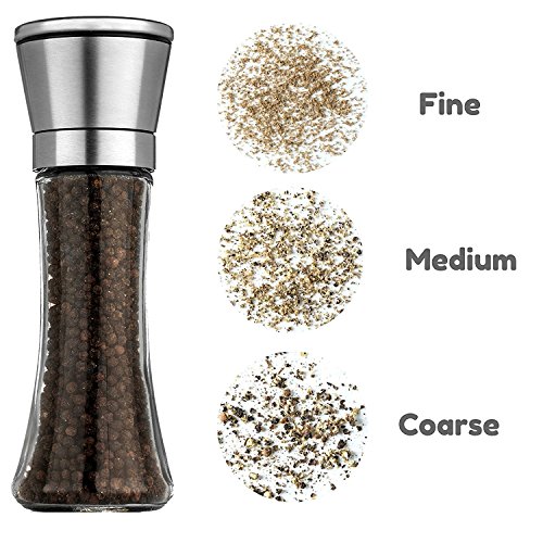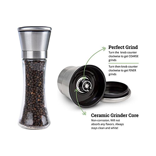 WHEN QUALITY MEETS QUANTITY: The Salt and Pepper Shakers Set we provide is tall enough to fill with pepper and salt, and keep it at least for a few months. Its well made ceramic rotor is not going to fail you! Neither the thick glass, nor the stainless steel top will. Strong and sturdy this device is here to last and give a fine elegant touch in your kitchen and your table.