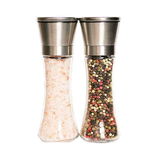Ahyuan Salt And Pepper Grinder A Dual Set Of Combo Grinders For Salt & Pepper Made Of Thick Glass Combined With Stainless Steel Top 7.5Inch Tall Glass Bottle 6 Ounce Volume