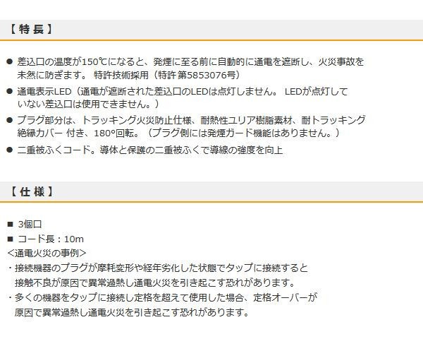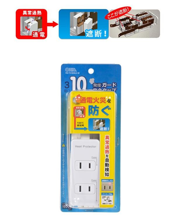 差込口温度が150度になると、発煙に至る前に自動的に通電を遮断して火災事故を未然に防ぎます。 製造国:中国 ※サプライヤー直送品 ご注文後2~3営業日後の出荷となります【商品名】オーム電機 OHM 発煙ガード安全タップ 3個口 10m HS-T310HG3-W