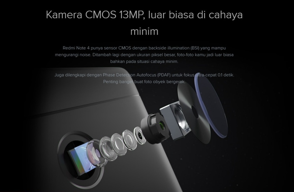 Kamera CMOS 13MP, luar biasa di cahaya minim Redmi Note 4 punya sensor CMOS dengan backside illumination (BSI) yang mampu mengurangi noise. Ditambah lagi dengan ukuran piksel besar, foto-foto kamu jadi luar biasa bahkan pada situasi cahaya minim. Juga dilengkapi dengan Phase Detection Autofocus (PDAF) untuk fokus ultra-cepat 0.1 detik. Penting banget buat foto obyek bergerak.