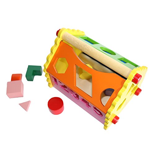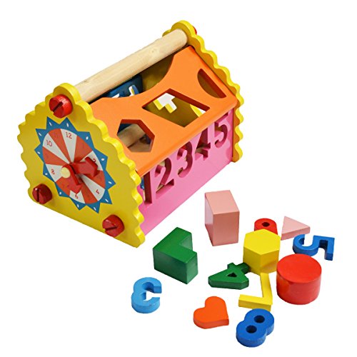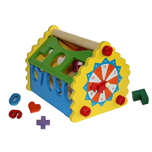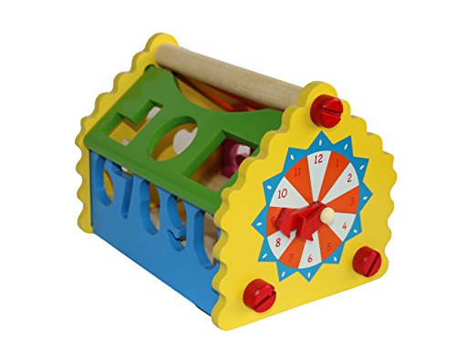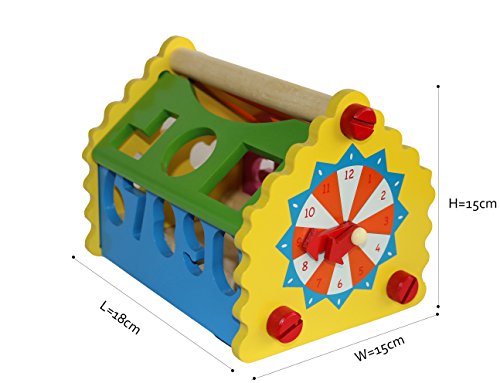 "What you get: A unique tool box shaped educational toy house. Teach your child to build a basic home with 6 colorful panels, 3 wooden bars and screws. Drop-in openings for numbers 0 to 9 in the wall. 7 unique shapes with corresponding drop-in holes on one wall. A clock on the side of the house features different colored moving hands for time telling. Easy-grab tool bar to lift and move the house as needed. No batteries, no plastic used. Learning made fun: Learning simple addition and subtraction with + and - signs and combination digits got a lot more easier for kids who learn on the go. A toy that promotes creativity, sensory, shape-recognition, fine motor and problem-solving skills. This learning toy encourages learning the dynamics of geometric shapes & time. How you benefit: A beautifully crafted wooden shape sorter house that spans out for several developmental stages .Reduces screen time, stimulates active engagement & imagination. Nurture your child's creativity & discovery with this timeless toy for those ever active babies. Make them learn numbers, shapes & time & tidying up, as the wooden shapes can be stored within the house when it needs to be put away!"Feature