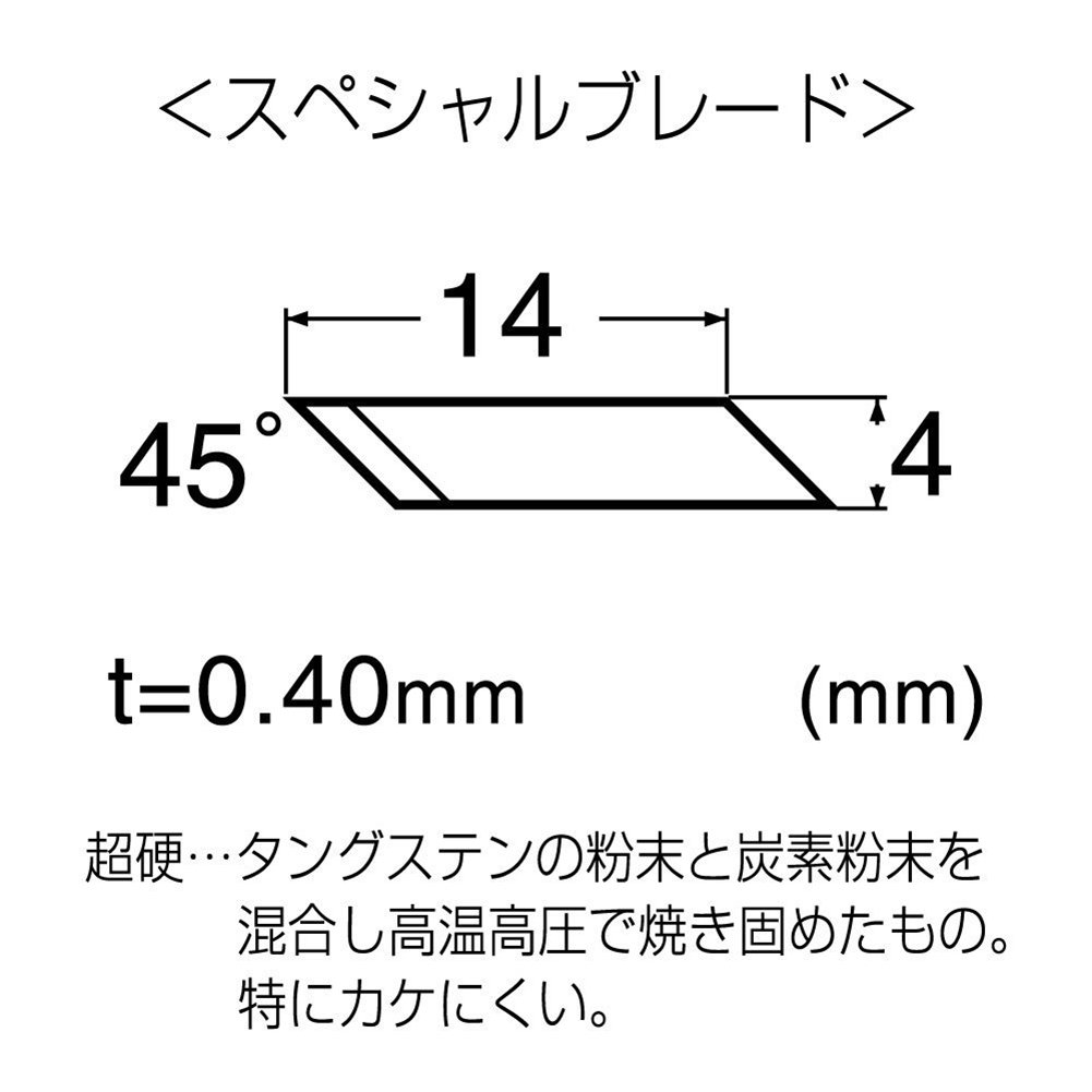 【刃渡り】長さ14mm×4mm 【刃厚】0.40mm 【材質】超硬:タングステンと炭素粉末の混合 【適合本体】D-400P、DS-800P等 【生産】日本製