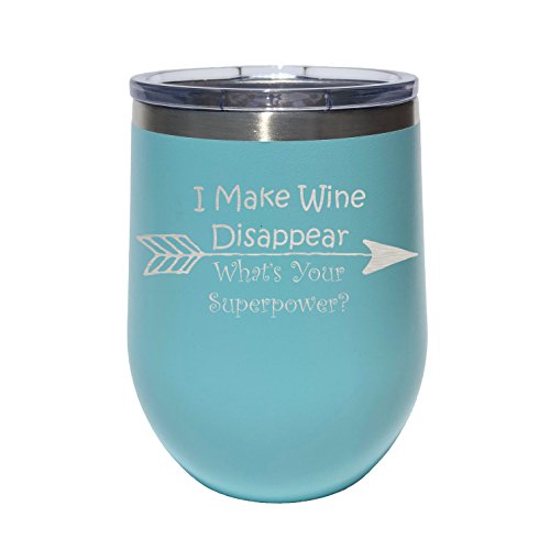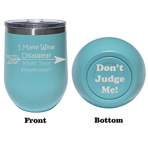 I Make Wine Disappear...What's Your Superpower? With a funny "Don't Judge Me" laser engraved on the bottom that people will see when you take a sip. Drink wine in style with a precision crafted tumbler that is as functional as it is beautiful. 12 oz. Stainless Steel Polar Camel Stemless Wine Glasses feature double-wall, vacuum insulation with a clear lid. They are 2X heat and cold resistant compared to glass or plastic wine glasses. Wine Glasses are BPA and lead free. Polar Camels are made from 18/8 gauge stainless steel (18% chromium/8% nickel) - also known as Type 304 Food Grade. Laser engraved with the highest quality. This will not wash off or fade with use.Feature