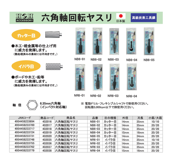【商品名】(業務用9個セット) H&H 六角軸回転ヤスリ/先端工具 【イバラ目】 外径:14mm 刃長:35mm 高級炭素工具鋼 日本製 NR6-01