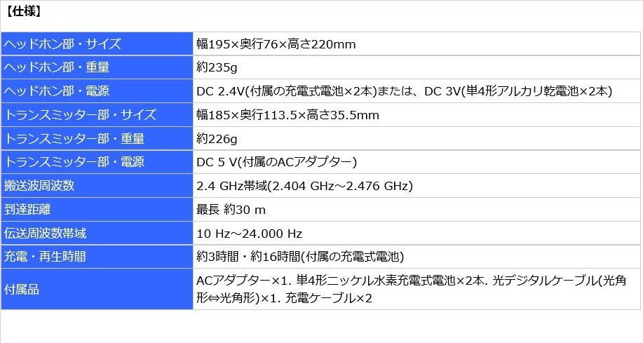 ●テレビにつなぐだけで、深夜でも映画やゲームの臨場感が7.1chワイヤレスで楽しめる。多彩な音声フォーマットに対応するとともに、直径40mm大口径ドライバーユニットとドルビープロロジックIIxデコーダー搭載により、臨場感にあふれた、迫力の7.1chサラウンド音場をワイヤレスヘッドホンで実現。●ソフトイヤーパッド、レザー調フリーアジャストバンドと軽量設計による快適な装着感。軽量設計(質量約235g)[付属ニッケル水素電池含む]と、ソフトイヤーパッドやレザー調フリージャストバンドの最適な装着性により、長時間の視聴も快適です。●付属の単4形ニッケル水素電池に加えて、アルカリ乾電池や充電式エボルタ、エネループ(ニッケル水素電池)も対応。従来機RP-WF7は、付属の単4形ニッケル水素電池専用の仕様でしたが、本製品はニッケル水素電池(充電式エボルタ、エネループ)も使用できるようになり、利便性が向上。