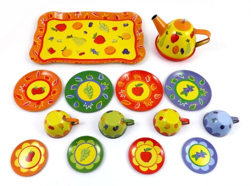 This wonderful tin tea set comes with a teapot, large tray, 4 cups, 4 saucers and 4 plates. Each pieces has lovely fruit garden design. It looks colorful and fun to play with.
