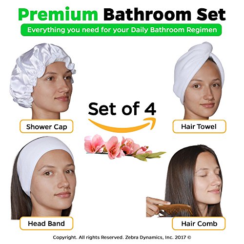 4in1 Premium Bathroom Set – Shower Cap, Hair Turban, Face Washing Elastic Hair Headband, Detangling Sandalwood Hair Comb.