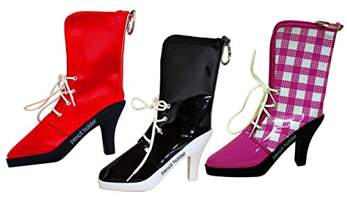 - Pencil pouch shaped and designed like a boot with a zipper closure; 6 x 9 x 2 inches