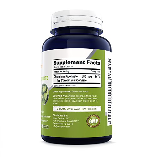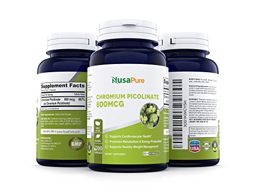✅ ✅ ✅ MAX STRENGTH CHROMIUM PICOLINATE (NON-GMO): NusaPure's maximum strength Chromium Picolinate supplement contains 800mcg of Chromium Picolinate per serving, and 200 capsules in each bottle for a full 200 day supply. Don't settle for other tablets or pills that only offer 500mcg of Chromium Picolinate per dose, or that only give you 90 or 120 capsules per bottle.*