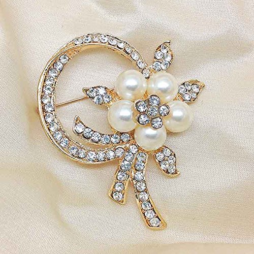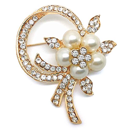 This captivating brooch features flower and leaves design accented with simulated Pearls and spray of sparkly Rhinestone crystals. Wear this to shine up your evening dress, sash, sleeve, or wrap. Measuring about 2 inches wide and 2.25 inches tall. Also ideal as a bridal gift. A gift that will definitely be treasured!Feature