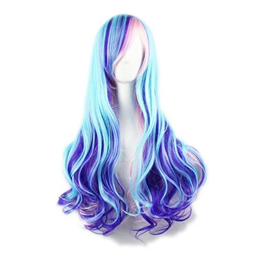 Upgrade Version Women Wigs Gradient Long Curly Hair Cosplay Party Costume Wig with A Hairnet (Blue Mixed Pink) BU040