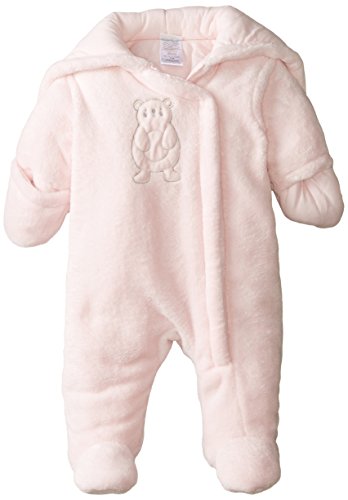 A baby girl's fuzzy plush snowsuit. The snowsuit is fully lined and has a snap novelty hood with ears on the hood. Comes with embroidered bear artwork. The snowsuit comes with fold over mitts and is footed.