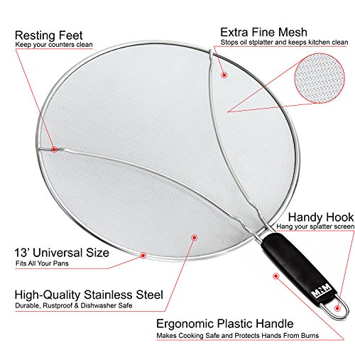 SAVE TIME AND ENERGY. The extra fine mesh splatter shield stops most of the splatter and keeps grease, oil and sauce off your stovetop. Keep your kitchen clean using the MNM Cuisine splatter guard. The resting feet will keep grease off your counters.