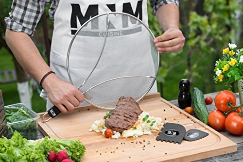 Grease Splatter Screen for Frying Pan by MNM Cuisine, 13 inch Splash Guard plus Pan Scrapers Set, Premium Stainless Steel with Resting Feet