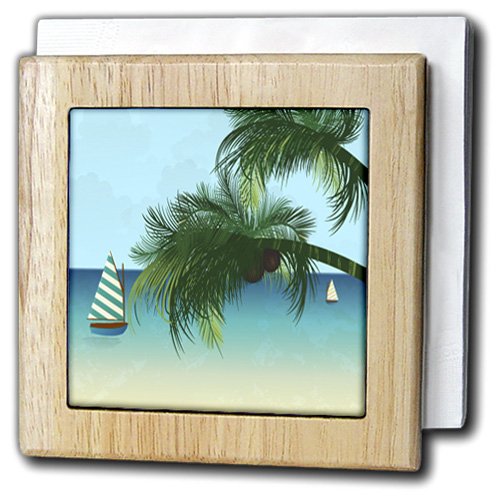 3dRose nh_235734_1 "Two Boats On A Calm Bay with Two Arcing Palm Trees Design" Tile Napkin Holder, 6", Natural