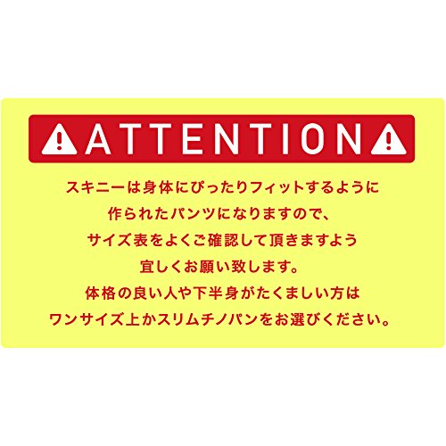 -. Feature : 【カラー】ブラック/ホワイト/ネイビー/ライトグレー/グレー/ワイン/カーキ/ベージュ / 【Sサイズ】ウエスト72cm/股上22.5cm/股下79cm/もも幅23.5cm/ヒザ幅16.5cm/裾幅14cm/ヒップ周り88cm【Mサイズ】ウエスト76cm/股上23cm/股下79cm/もも幅24cm/ヒザ幅17cm/裾幅14.5cm/ヒップ周り92cm / 【Lサイズ】ウエスト80cm/股上23.5cm/股下80cm/もも幅25cm/ヒザ幅17.5cm/裾幅15cm/ヒップ周り100cm【XLサイズ】ウエスト84cm/股上24cm/股下80cm/もも幅26cm/ヒザ幅18cm/裾幅15.5cm/ヒップ周り100cm / 【XXLサイズ】ウエスト88cm/股上24.5cm/股下81cm/もも幅26.5cm/ヒザ幅18.5cm/裾幅16cm/ヒップ周り102cm【素材】コットン95%ポリウレタン5% / シンプルなデザインだからこそシルエットに拘り、脚長・美脚効果が出るまで何度も試行錯誤を繰り返したスキニーパンツ。トレンドやジャンルを問わず、また程よい厚みで春夏秋冬ロングシーズンお使い頂けるパンツです。