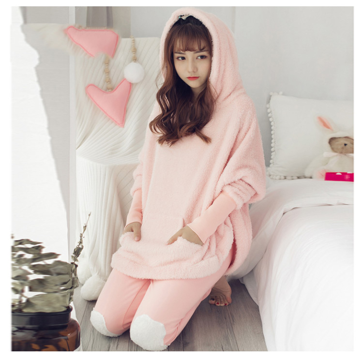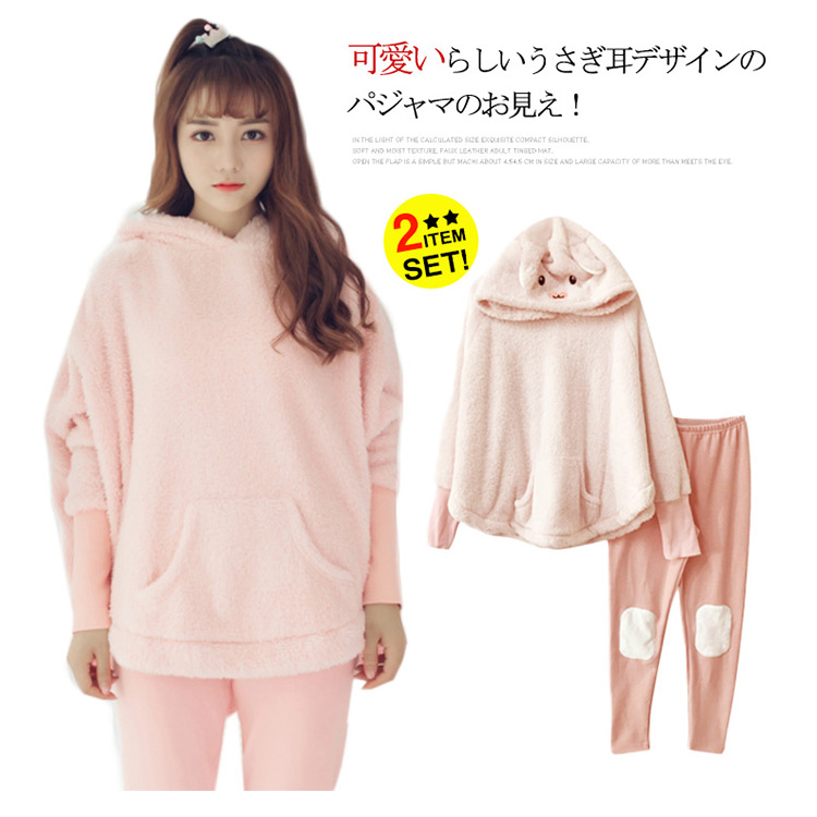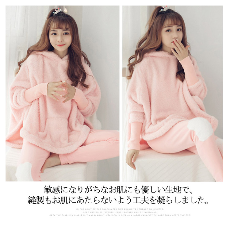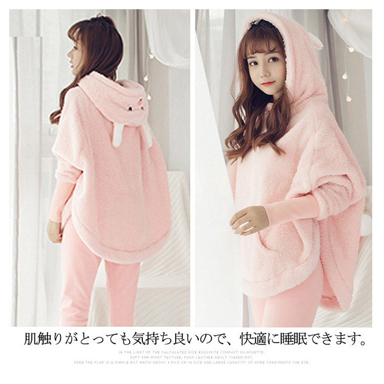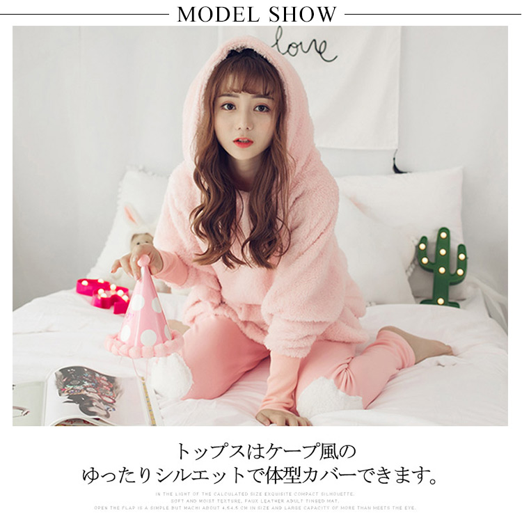 | 可愛いらしいうさぎ耳デザインのパジャマのお見え!トップスはケープ風のゆったりシルエットで体型カバーできます。敏感になりがちなお肌にも優しい生地で、縫製もお肌にあたらないよう工夫を凝らしました。ふわふわ もこもこで良質の質感。 肌触りがとっても気持ち良いので、快適に睡眠できます。 | |