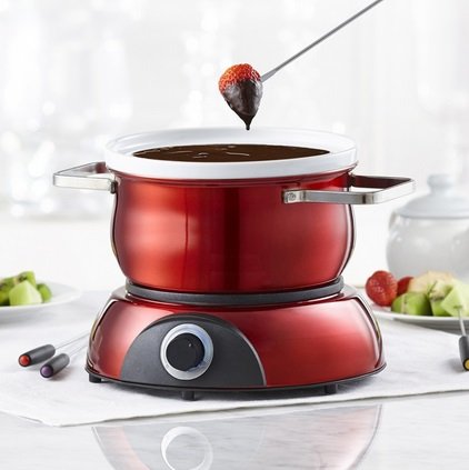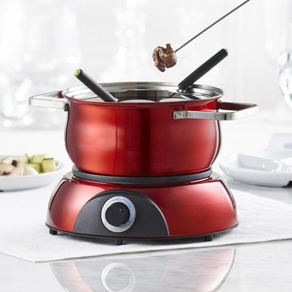 The scarlet 3-in-1 electric fondue set is ideal for chocolate, meat or cheese and holds a generous 84 oz Capacity. The set is constructed of stainless steel with stoneware insert. The stoneware double boiler insert keeps cheese or chocolate from scorching. It features a 1500 watt stainless steel electric base with quick release breakaway cord for safety. Set includes a stainless steel pot and fork guide for meat fondue, 6 stainless steel forks with colored ends to easily identify your fork, and a safety burner with cool-touch handles. Use as a water Bath/chafing dish for hot dips too! a handy recipe booklet is included. Since 1889, Trudeau has developed Visionary products that add and exciting flavor to your day. Trudeau draws inspiration from more than a century of know how. Style, elegance, innovation. Trudeau lets you savor life's little moments.Feature