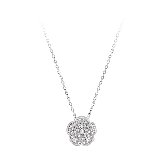 * 활짝 피어난 하얀 매화꽃 쉐입에 스톤을 정교하게 파베 셋팅하여 반짝임을 극대화한 솔리테어 목걸이로